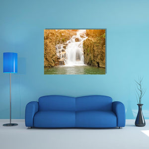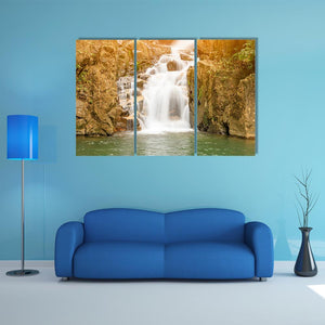 This photorealistic print shows a waterfall flowing over rocks with green foliage and sunlight filtering through the trees. The scene is serene and peaceful, with motion blur on the water and a rule-of-thirds composition that guides the eye. It fits well in living rooms or nature-themed rooms.