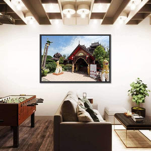 Experience the tranquil beauty of Thailand with this canvas wall art depicting the ornate architecture of Nantaram Temple. Rich in gold, white, and green hues, the piece features intricate carvings and decorative statues, creating a peaceful and spiritual atmosphere perfect for any space.