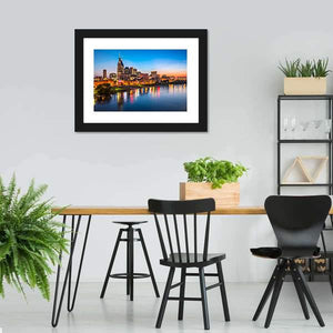Capture the vibrant energy of Nashville with this striking city skyline artwork. Featuring illuminated skyscrapers and reflections on the water, it evokes a bustling twilight scene perfect for any modern décor.
