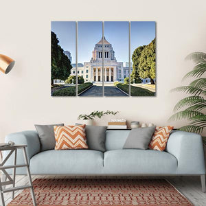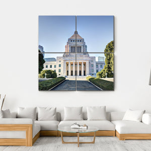 This canvas showcases the National Diet House in Japan, surrounded by manicured hedges and lush trees. The serene mood is enhanced by a clear blue sky and a photorealistic depiction of classical architecture, making it a grand addition to any wall decor.