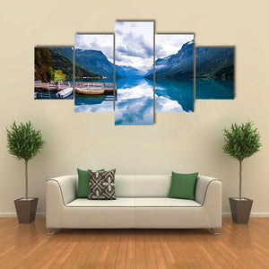 Lovatnet Lake with Boats and Dock Canvas Wall Art