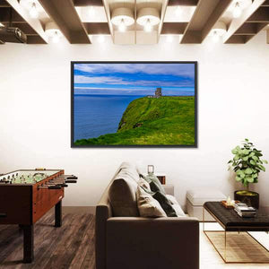 A realistic landscape of the Cliffs of Moher showing coastal cliffs, a ruined tower on the cliff edge, vibrant green grass and a blue ocean beneath a cloudy sky. The wide, rule-of-thirds composition feels serene and majestic, and it works well in modern living rooms or entryways as a nature-focused focal piece.