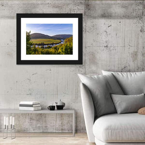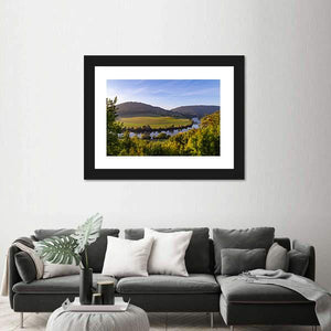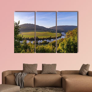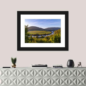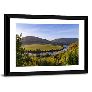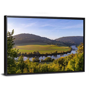 Neckarsteinach, Germany at sunrise shows a wide, high‑angle view of a gentle river bend winding past rolling hills, trees and meadow. The realistic scene feels serene and peaceful, with greens, blues, browns and soft yellow light; the water reflects the sky and a faint contrail crosses above. Suited to modern rooms and calm living spaces, the print adds a natural, restful presence to a wall.
