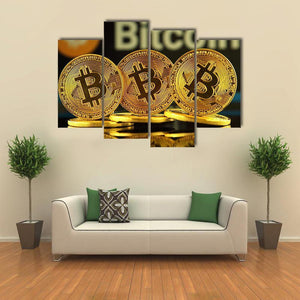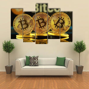 This canvas art features the word 'Bitcoin' in bold typography above three glimmering gold Bitcoin coins. The modern and futuristic vibe makes it a standout piece, perfect for adding a touch of financial elegance to your décor.