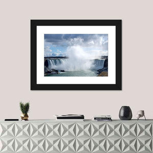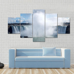 This canvas art captures the powerful majesty of Niagara Falls with a wide shot featuring the waterfall, water, and mist rising into a bright sky. The natural palette of blues, greens, and whites evokes a serene yet dynamic atmosphere, making it a beautiful addition to any nature-themed decor.