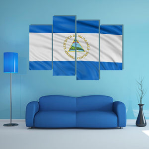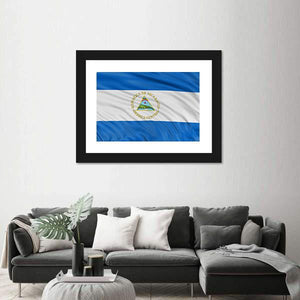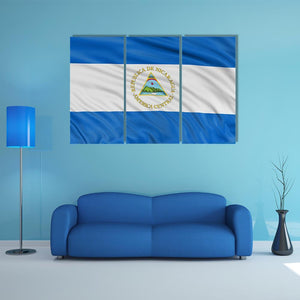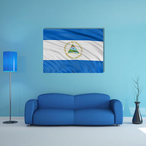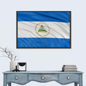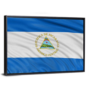 Waving Nicaragua Flag Canvas depicts the Nicaraguan flag and national emblem with the Spanish legend "REPUBLICA DE NICARAGUA AMERICACENTRAL" centered in the image. Rendered in blue, white, green, yellow and brown with a realistic look, it brings a patriotic tone that works well in modern home or room decor.