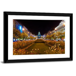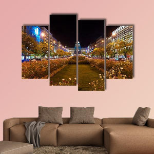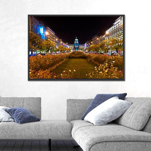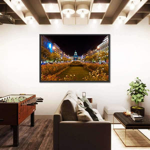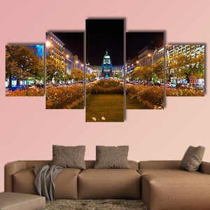 Prague City At Night presents a realistic, vibrant night cityscape of streets, buildings, a park and flowered walkways, lit by warm streetlights and a distant domed structure. The yellow, green, blue, brown and white palette gives the scene a grand, lively mood that fits modern room decor.