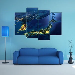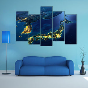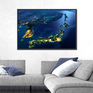 This stunning artwork presents Earth at night from an aerial perspective, highlighting city lights and coastlines. Its deep blue palette, mixed with bright yellows and oranges, evokes a sense of awe and wonder, making it an ideal piece to add a global touch to your decor.