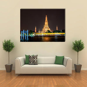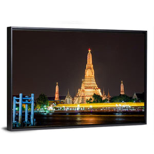 Wat Arun Ratchawararam Temple appears at night in this realistic cityscape print, the illuminated temple spire reflected on the river with streaking boat lights. Rich golds, yellows and deep blues create a vibrant, dynamic nocturnal mood that suits modern living rooms or entryways.