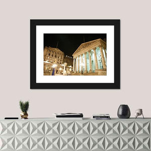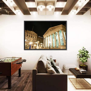 This canvas features a beautiful cityscape of the Royal Stock Exchange, showcasing its grand classical architecture at night. The illuminated scene, with its striking columns and intricate pediment sculpture, invites a sense of historic serenity.
