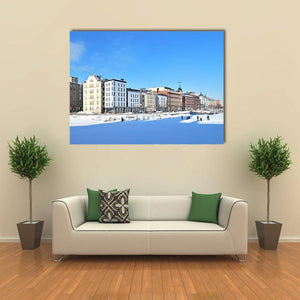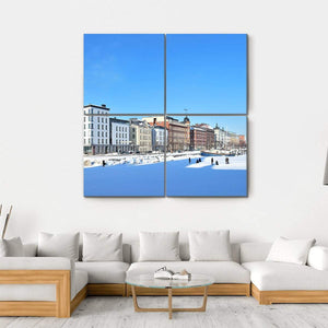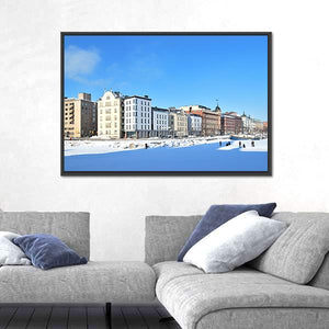 This canvas features a panoramic view of North Quay in winter, showcasing stunning buildings reflected in a serene, frozen body of water. The calming palette of blues, whites, and browns captures the essence of a peaceful winter day.