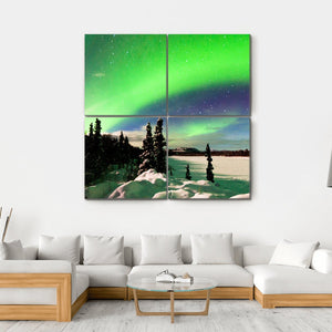 Experience the awe of the aurora borealis with this stunning canvas art depicting a snowy landscape under a starry night sky. The vibrant colors of green, purple, and blue create a serene atmosphere that brings the beauty of nature indoors.