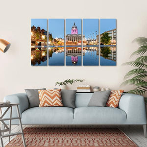 This elegant cityscape features the Nottingham Council House, illuminated beautifully by pink lights. The serene water reflections create a vibrant atmosphere that complements any modern decor.