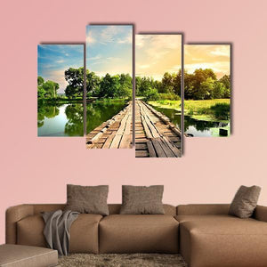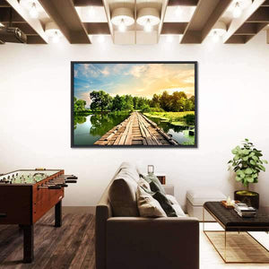 Old Bridge Over River Canvas Wall Art features a centered wooden bridge leading across a calm river with rippling water reflections and a dramatic clouded sky, giving the scene a peaceful, natural mood. Greens, blues, browns and soft yellows lend a rustic feel that works well in nature-inspired or modern rooms.