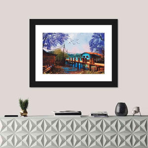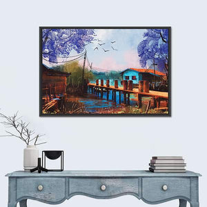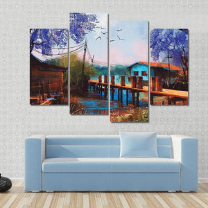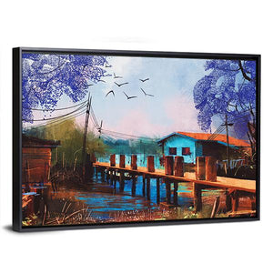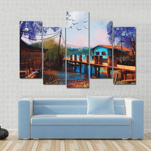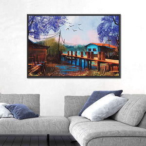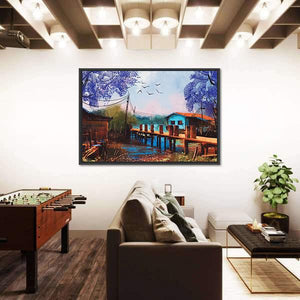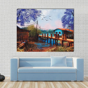 This tranquil piece captures a rustic fishing village scene with a dock, calm water, and a blue building topped with an orange roof. Enhancing the peaceful atmosphere, a flock of birds glides in a v-shape across the sky, making it an ideal addition for any serene space.