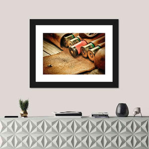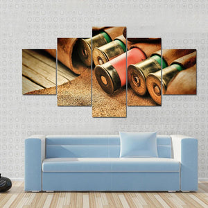 This canvas art features a close-up of shotgun shells nestled in a vintage leather pouch on a rustic wood surface. With its rich brown and earthy palette, it evokes a warm, nostalgic atmosphere perfect for enhancing your home decor.
