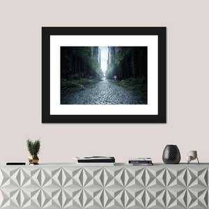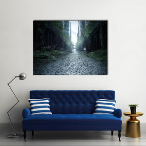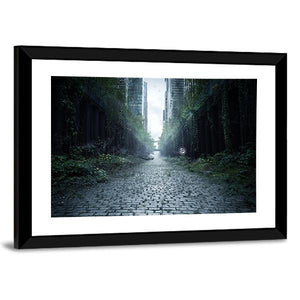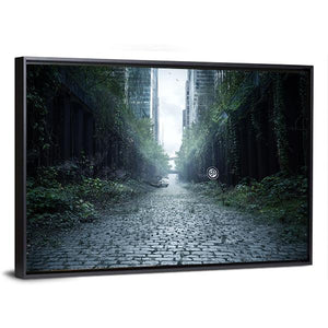 A cobblestone street winds between overgrown buildings and trees in this photorealistic landscape. The gray, green and brown palette with a symmetrical, leading-lines composition creates an eerie, quiet, post-apocalyptic mood. It fits well in modern or minimalist interiors that favor dramatic, evocative art.