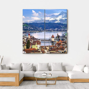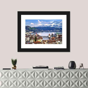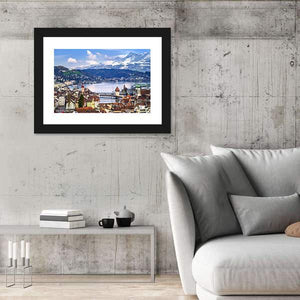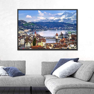 This canvas wall art features a picturesque cityscape of an old town nestled by a serene lake, framed by majestic, snow-capped mountains. The vibrant colors of blue, red, and green create a lively atmosphere, perfect for adding a touch of nature to any space.