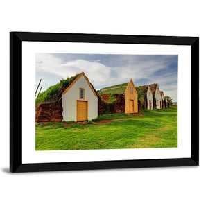 This landscape piece captures the serene beauty of grass-roofed houses set against rolling hills and a clear sky. Its rustic and natural elements evoke a peaceful atmosphere, making it a charming addition to your home decor.
