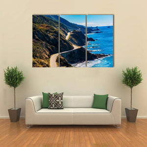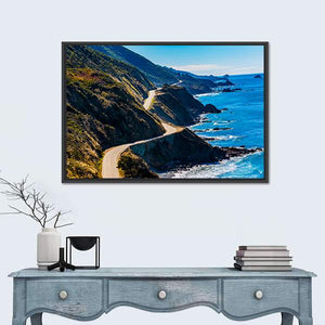 Pacific Valley In California Canvas Wall Art depicts a winding coastal road beside cliffs and the ocean, complete with a yellow dividing line. The realistic palette of blues, greens, browns and touches of yellow creates a serene, adventurous scenic mood. It pairs well with modern home decor in a living room or hallway.