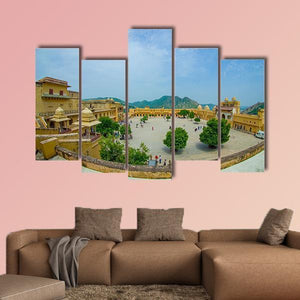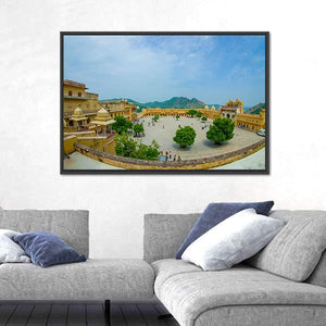 Palace In Amber Fort Canvas Wall Art depicts a wide, sunlit courtyard of a historic fortress with domed architecture, people in the courtyard, and tree-lined hills beyond. The realistic yellow, blue, green, and brown palette creates an expansive, historic mood that suits modern home decor.