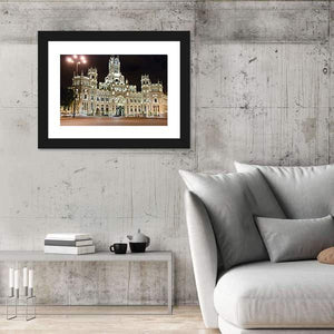 Palacio de Cibeles At Night captures the ornate building facade and clock tower in a realistic night cityscape. The black, white, yellow and grey palette gives a majestic, illuminated mood that works well in modern living rooms, entryways, or offices.