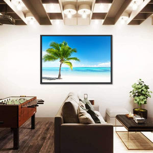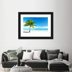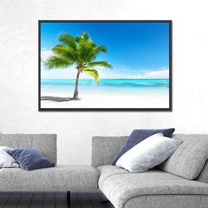 This vibrant artwork features a serene tropical beach with a single palm tree against a clear blue sky. The calming palette of blues and greens evokes feelings of peace and vacation, making it a perfect addition to your home decor.