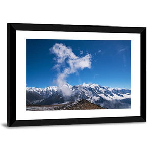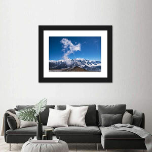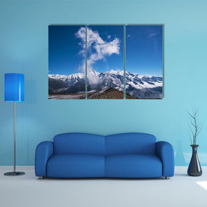 Snow-capped mountains beneath a clear blue sky create a wide mountain vista, with sunlight illuminating the peaks and textured cloud formations. The photorealistic nature photography evokes a majestic, serene, and vast atmosphere in blue, white, brown, and gray tones. Suited to modern room decor and contemporary home interiors.