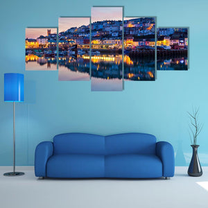 Experience the serene beauty of Brixham Harbour at dusk with this canvas wall art. Rich hues of blue, orange, and pink blend seamlessly, showcasing illuminated buildings, docked boats, and their reflections on the water. This piece adds a touch of tranquility to any space.
