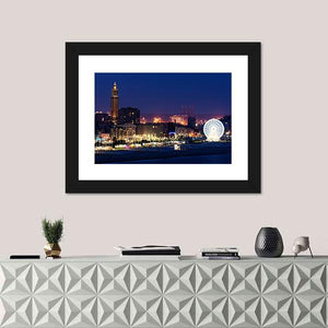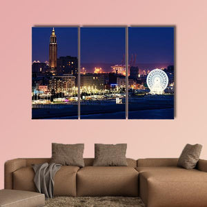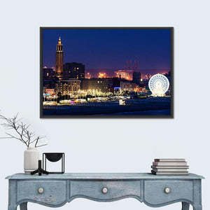 A photorealistic night view of Le Havre’s coastal skyline, featuring a ferris wheel and tower lit in blue, yellow and white. Lights shimmer on the water, giving a vibrant, illuminated, lively atmosphere that fits modern living rooms or entryways.