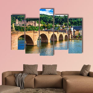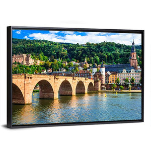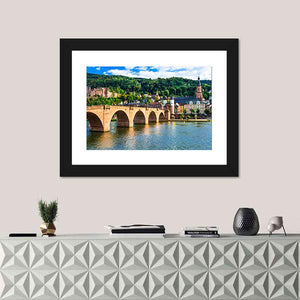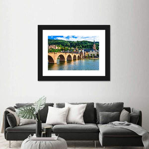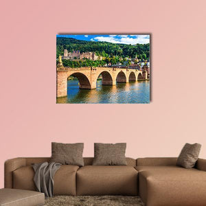 Panoramic View Of Heidelberg Town shows a riverside scene with a stone-arched bridge and a castle on a green hill beneath a blue, cloud-dappled sky. The rule-of-thirds composition creates a balanced, picturesque and historic mood. It fits well in homes and living spaces, especially modern interiors, as a scenic wall accent.