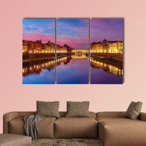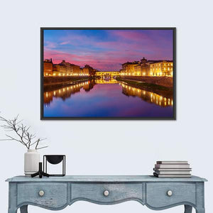 Panoramic View Of River Arno shows the river, buildings and a bridge at dusk with city lights reflected across the water. Rendered in a realistic style with blue, pink, yellow and brown tones and a balanced, symmetrical composition, it feels peaceful and romantic. A quiet cityscape that suits living rooms or entryways as room decor.