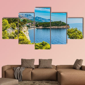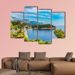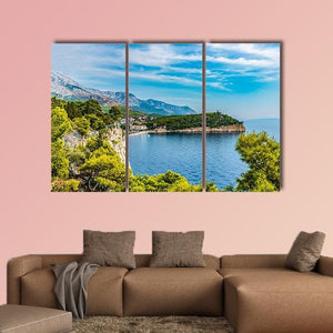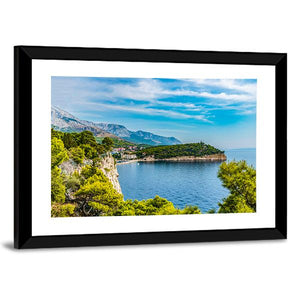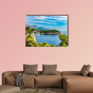 Panoramic View Of The Old Town Croatia shows a high-angle landscape of a coastal town with ocean, mountains, and trees. The scene feels serene and picturesque, with blue-green tones, houses along the shore, and a light pole on the peninsula beneath a cloudy sky. It pairs well with modern or coastal-inspired room decor.