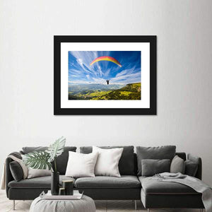 This captivating canvas art captures a paraglider soaring over majestic mountains under a bright blue sky. The scene conveys a serene yet adventurous spirit with lush green hills and wispy clouds, perfect for adding a touch of nature's beauty to your space.