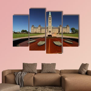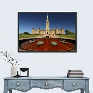 Parliament Hill photographed from a low, wide-angle view, highlighting the parliament building and its circular fountain beneath a clear blue sky. The blue, tan, green and bronze palette gives the scene a grand, majestic feel and fits modern house décor, such as living rooms or entryways.