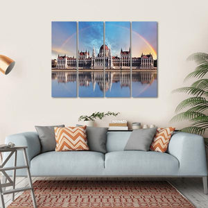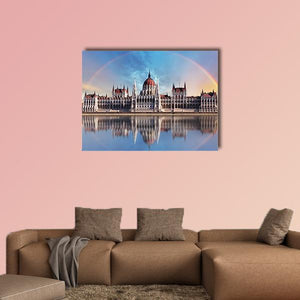 This canvas features the breathtaking Parliament building in Hungary, perfectly captured with serene reflections on calm water. A clear rainbow arcs gracefully above, enhancing the artwork's majestic and hopeful vibe.