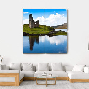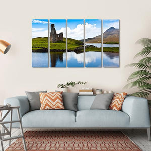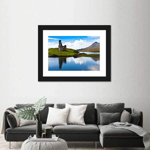 Discover serene beauty with this canvas art featuring the stunning ruins of a Scottish castle. The picturesque scene showcases lush hills, a tranquil lake, and a clear sky, evoking a sense of history and calmness.