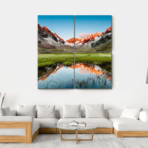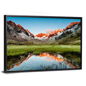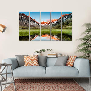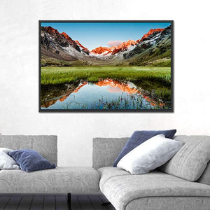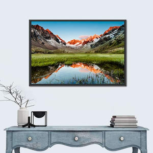 This canvas art features a majestic mountain range reflecting in a calm lake, capturing the serene beauty of nature. The blue and green palette, accented by sunlight hitting the snow-capped peaks, evokes a peaceful atmosphere, making it a charming addition to any space.