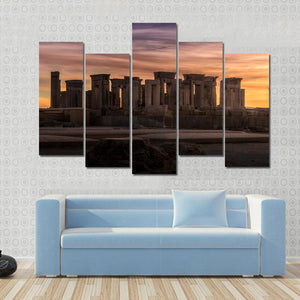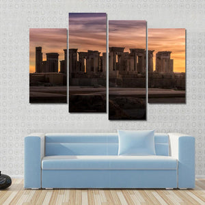 This canvas art captures the ancient ruins of Persepolis under a dramatic sunset sky. With its serene palette of orange, purple, gray, and brown, it evokes a historical mood, inviting contemplation and appreciation of this majestic site.