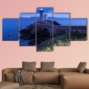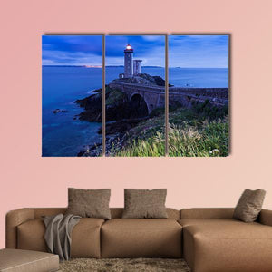 A photographic canvas of the Petit Minou lighthouse in France, set beside a stone coastal bridge and windswept grasses at dusk. Cool blues, grays and greens create a peaceful yet slightly dramatic twilight mood with distant lights on the horizon. The composition uses depth and the rule of thirds, making this piece a calm focal for coastal or modern room decor.