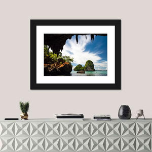 This captivating artwork features a stunning view through the opening of a tropical sea cave in Thailand. Lush vegetation and dramatic rock formations contrast beautifully with the blue ocean and white clouds, creating a serene and natural atmosphere.
