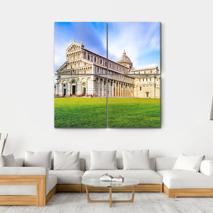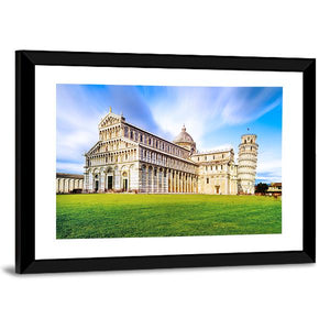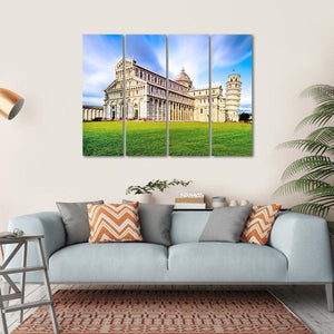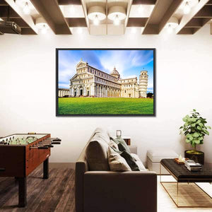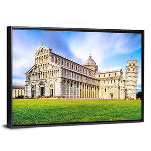 This vivid canvas art captures the iconic Leaning Tower of Pisa alongside a beautiful cathedral, embodying the vibrancy of Italy. The sunny palette of green, blue, and white enhances its realistic portrayal, making it a delightful addition to any art collection.