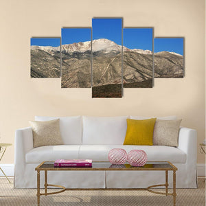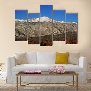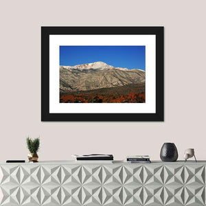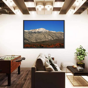 Pikes Peak in Colorado is captured under a clear blue sky in this realistic landscape print, with snow-capped peaks and dense forests showing red and orange autumn leaves. The scene feels grand, serene, and crisp, with cool blues and warm fall tones. It suits modern or nature-inspired rooms as a calm focal point.