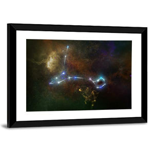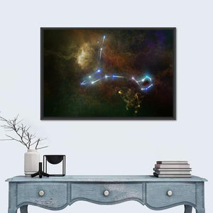 This Pisces constellation canvas centers the zodiac pattern with glowing lines that connect the stars over a cloudy nebula background. Layers of blue, purple, yellow, green and black create a cosmic, mysterious, ethereal atmosphere that fits modern and contemporary rooms.