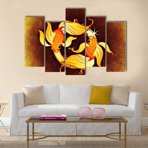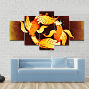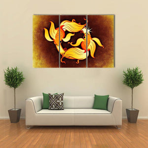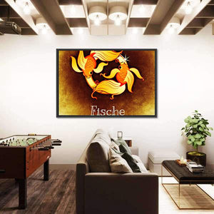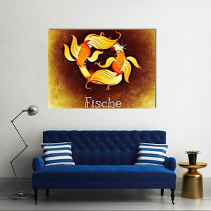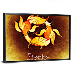 This Pisces Horoscope Canvas Wall Art shows two fish arranged in a circular, stylized graphic with the word "Fische" included in the design. Rendered in warm orange, yellow, brown and white tones, the piece feels calm, mystical and symbolic and fits modern or astrology-themed rooms.