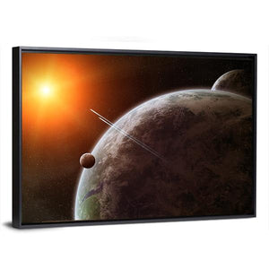 Explore the vastness of space with this captivating canvas artwork featuring a vibrant planet, its moon, and a distant sun. The cosmic scene evokes feelings of awe and wonder, making it a striking addition to any modern decor.