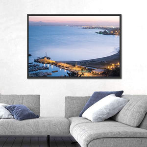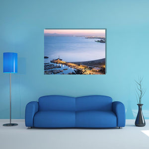 This canvas wall art captures a high-angle view of the Port of Sidi Bou Said, showcasing boats docked in a serene harbor. The tranquil hues of blue, pink, and yellow create a peaceful atmosphere, perfect for enhancing your space.