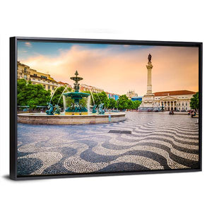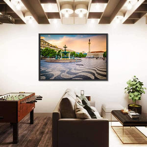 A realistic canvas view of Rossio Square in Portugal, showing the ornate fountain, a tall column with statue, classical buildings and the patterned wavy cobblestone pavement. Bright blues, greens, browns and warm yellows give the scene a vibrant, sunny, grand atmosphere and emphasize depth along the receding pavement. Suited to living rooms, entryways, or offices with classic or modern décor.