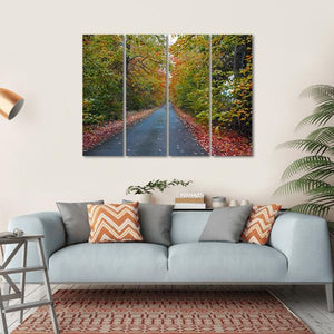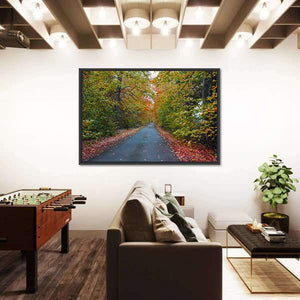 This artwork captures a tranquil scene of a country lane lined with trees, adorned with autumn leaves in vibrant shades of green, orange, and red. The wet asphalt road, framed by fallen leaves, invites a sense of peace and serenity, making it a delightful addition to any nature-inspired decor.