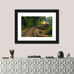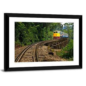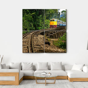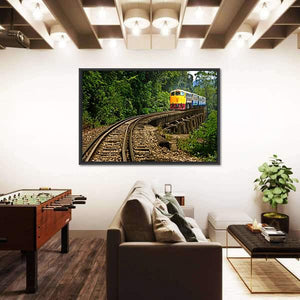 This canvas art captures the serene adventure of a train journey in Kanchanaburi Province, Thailand. Featuring winding railroad tracks and a vibrant yellow and blue train against a lush forest backdrop, it evokes a sense of wanderlust and tranquility.